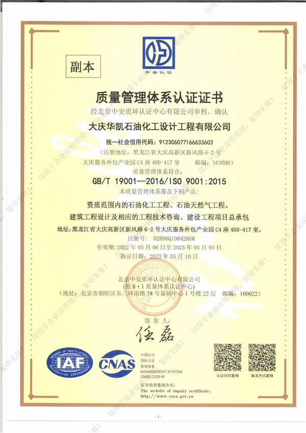 近日,我司順利通過質(zhì)量管理體系認(rèn)證,這標(biāo)志著華凱公司在項(xiàng)目質(zhì)量體系建設(shè)上已經(jīng)達(dá)到了相關(guān)標(biāo)準(zhǔn)。質(zhì)量管理體系認(rèn)證證書的取得同時(shí)也是公司各項(xiàng)管理工作的規(guī)范化、標(biāo)準(zhǔn)化的體現(xiàn),是對(duì)公司持續(xù)穩(wěn)定健康發(fā)展的重要保證。我們將進(jìn)一步優(yōu)化和規(guī)范各項(xiàng)管理制度,不斷提高體系運(yùn)行的有效性,不斷提高公司的管理水平,共同推進(jìn)公司的快速發(fā)展。自此,華凱公司質(zhì)量管理體系的標(biāo)準(zhǔn)化、規(guī)范化及科學(xué)化又邁上新臺(tái)階。